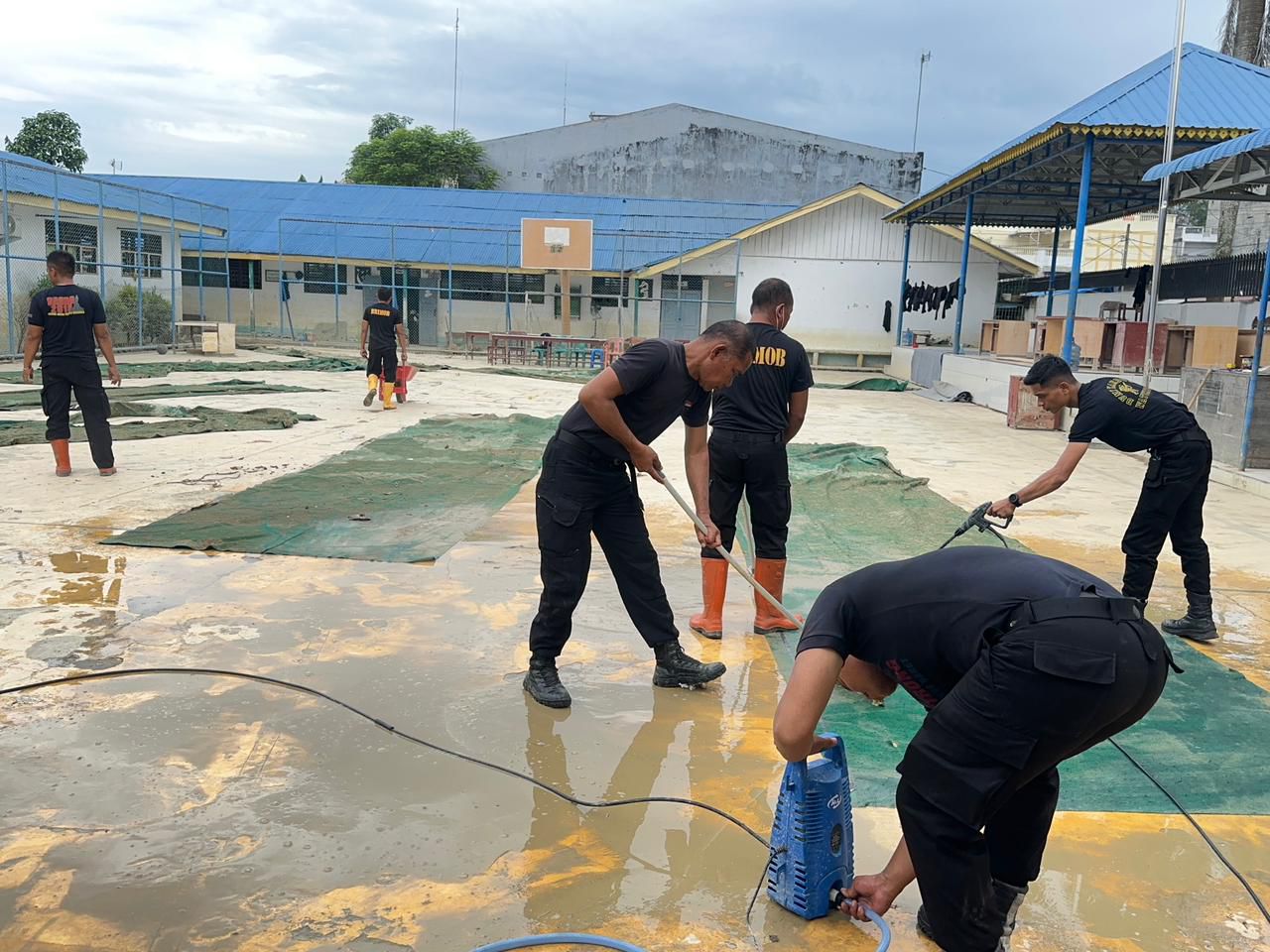Kegiatan pembersihan melibatkan personel Brimob Polda Sumut yang dibagi ke beberapa kelompok kerja. Personel secara gotong royong membersihkan ruang kelas, kantor guru, halaman, hingga saluran drainase, dibantu peralatan kebersihan dan perlengkapan pendukung lainnya.