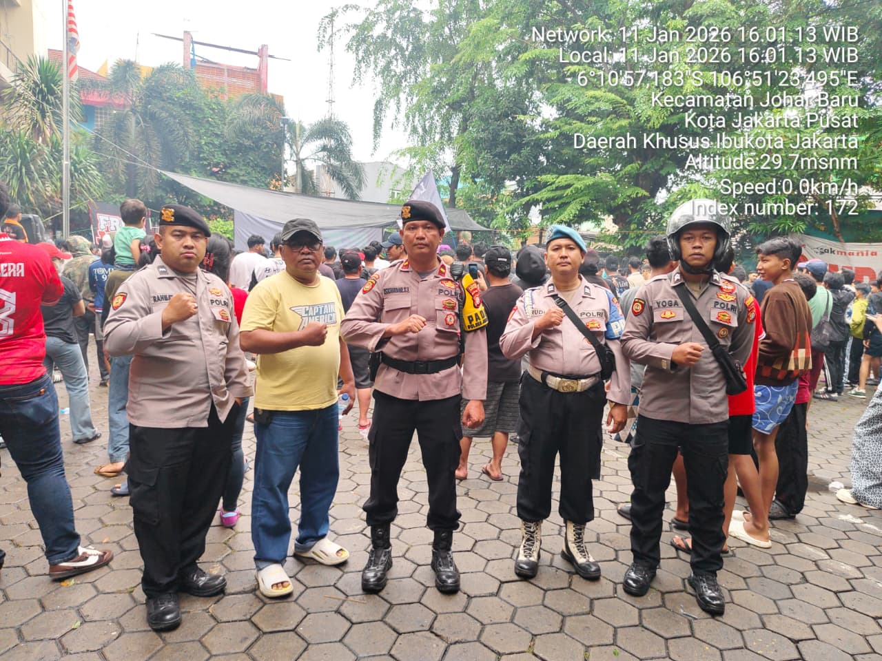 Jakarta Pusat – Jajaran Polsek Johar Baru memastikan keamanan selama kegiatan nonton bareng (nobar) pertandingan sepak bola antara Persija Jakarta dan Persib Bandung berlangsung aman. Kegiatan berlangsung pada Minggu (11/1/2026) sekitar pukul 16.00 WIB di Jl. Johar Baru Utara I, Kelurahan Johar Baru, Kecamatan Johar Baru, Jakarta Pusat.