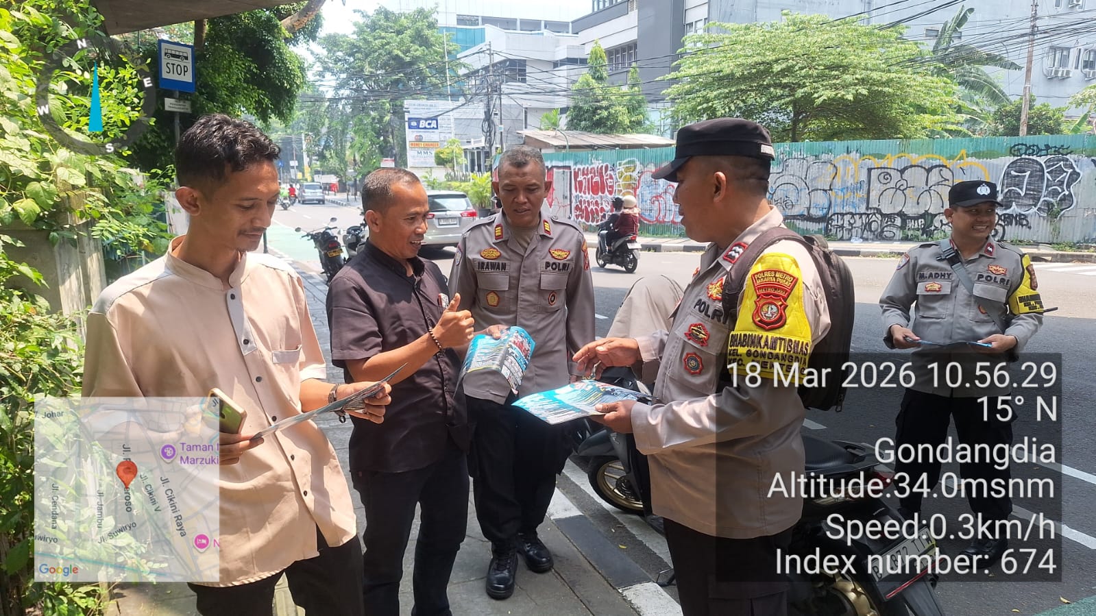 Dipimpin oleh Kanit Binmas Polsek Metro Menteng, AKP Irawan Junaedi, kegiatan sosialisasi tersebut turut melibatkan para Bhabinkamtibmas, di antaranya Bhabinkamtibmas Gondangdia Aiptu Kamidi, Bhabinkamtibmas Menteng Aiptu Robby Danan Jaya, serta Bhabinkamtibmas Pegangsaan Aipda H.M. Adhy M.N. Mereka secara aktif membagikan brosur serta memberikan penjelasan langsung kepada masyarakat di kawasan Jalan RP. Soeroso, Kelurahan Gondangdia, Kecamatan Menteng, Jakarta Pusat.