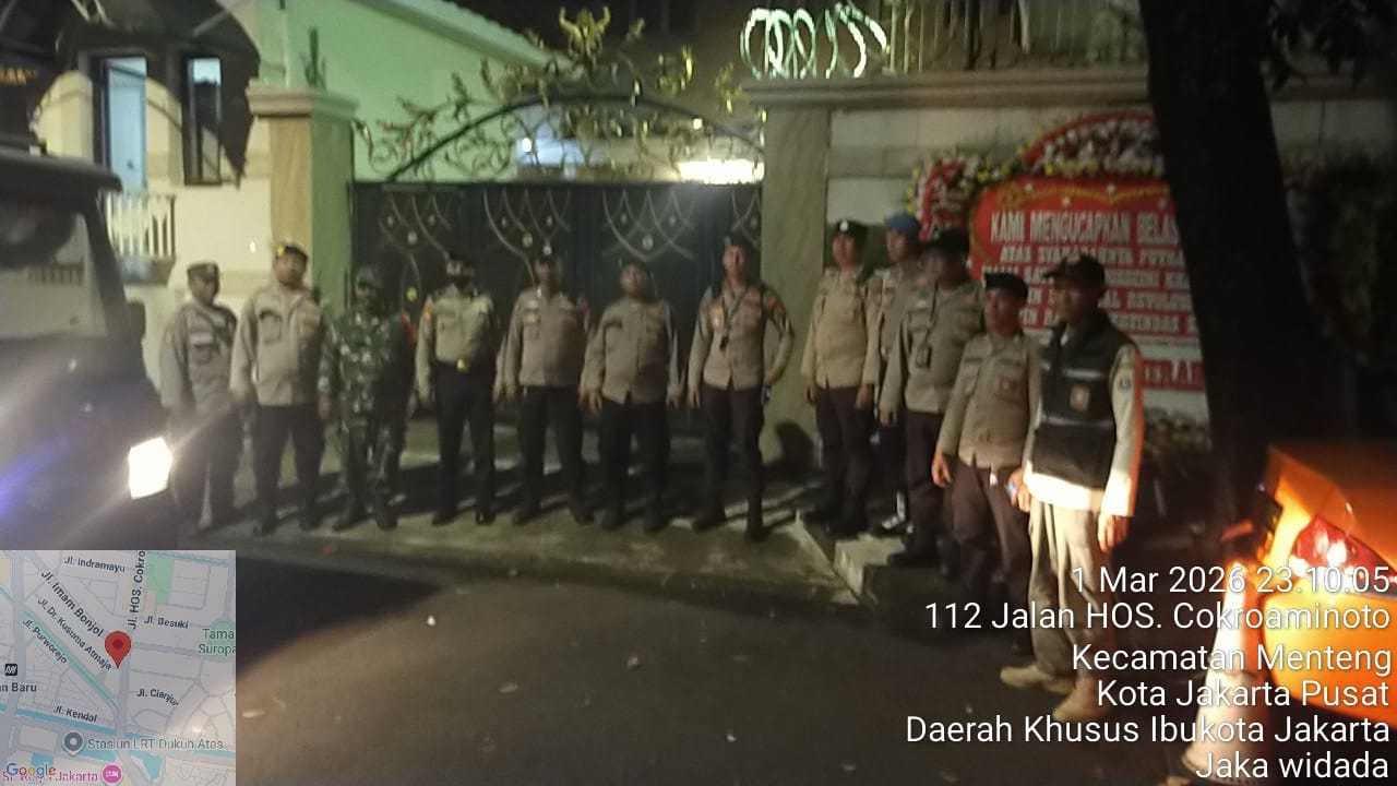 Jakarta Pusat — Menyikapi dinamika situasi geopolitik internasional yang berdampak pada keamanan dalam negeri, Polsek Metro Menteng bersama Tiga Pilar melaksanakan patroli dan pemantauan intensif di sekitar Kedutaan Besar Iran yang berlokasi di Jalan HOS Cokroaminoto, Menteng, Jakarta Pusat. Kegiatan ini dilakukan seiring meningkatnya aktivitas masyarakat yang menyampaikan belasungkawa menyusul konflik dan agresi militer yang melibatkan Amerika Serikat dan Israel terhadap Iran, yang mengakibatkan wafatnya pimpinan tertinggi negara Iran. Senin (2/3/2026)