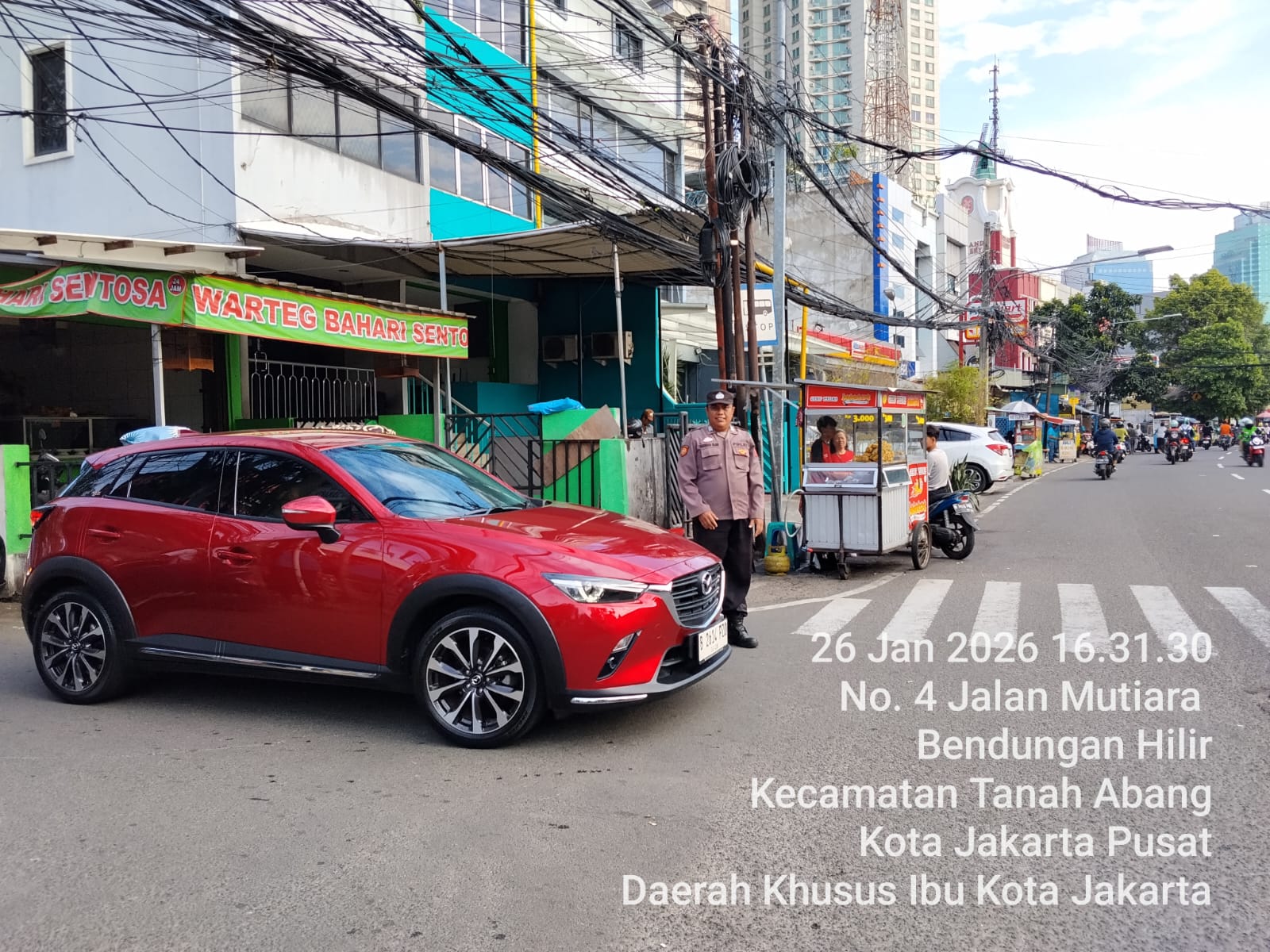 Jakarta Pusat — Guna menjaga kelancaran arus lalu lintas serta menciptakan situasi kamtibmas yang aman dan kondusif, jajaran Polsek Metro Tanah Abang melaksanakan kegiatan pengaturan lalu lintas dan Strong Point / Police Hazard di Pertigaan Jalan Mutiara, Bendungan Hilir, Tanah Abang, Jakarta Pusat, pada Senin (26/01/2026).