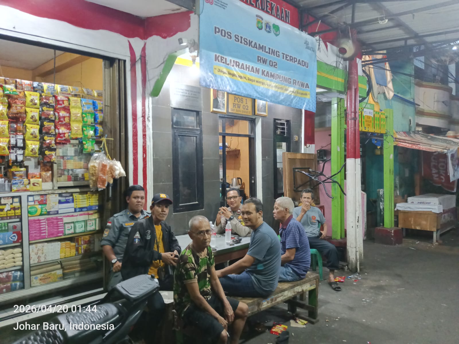 Jakarta Pusat – Upaya menjaga keamanan dan ketertiban masyarakat (kamtibmas) terus digencarkan jajaran Polsek Johar Baru melalui patroli wilayah dan sambang ke pos keamanan lingkungan (satkamling). Kegiatan tersebut dilaksanakan di Poskamling RW 02, Kelurahan Kampung Rawa, Kecamatan Johar Baru, Jakarta Pusat, pada Senin (20/4/2026) pukul 01.45 WIB.