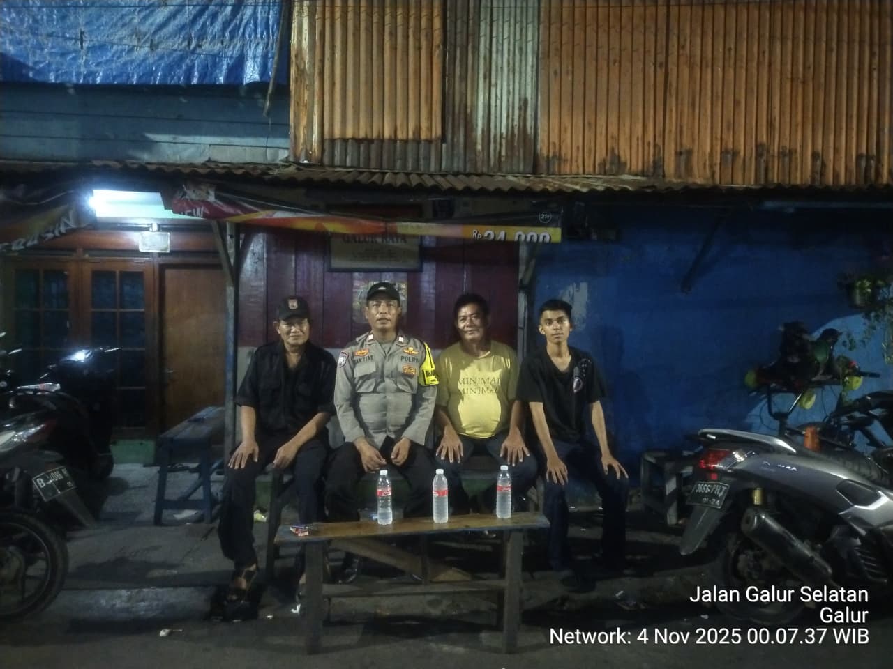 Kegiatan berlangsung di Pos Kamling RW 01 Jl. Galur Selatan, di mana Aiptu Baktiar bergabung bersama Bapak Sahyari dan Bapak Syahri selaku hansip RW 01 serta Bapak Ito, warga setempat. Dalam kesempatan tersebut, ia menyampaikan pesan-pesan Kamtibmas agar warga tetap meningkatkan kewaspadaan terhadap potensi gangguan keamanan, khususnya pada malam hari.