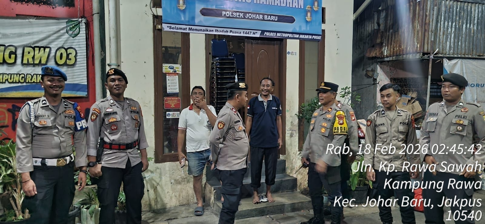 Jakarta Pusat – Dalam rangka menyambut Bulan Suci Ramadhan dan menjaga situasi kamtibmas tetap aman serta kondusif, jajaran Polsek Johar Baru melaksanakan Patroli Cipta Kondisi Antisipasi Gangguan Kamtibmas (Guantibmas) pada Rabu, 18 Februari 2026 pukul 02.08 WIB di wilayah hukum Polsek Johar Baru.