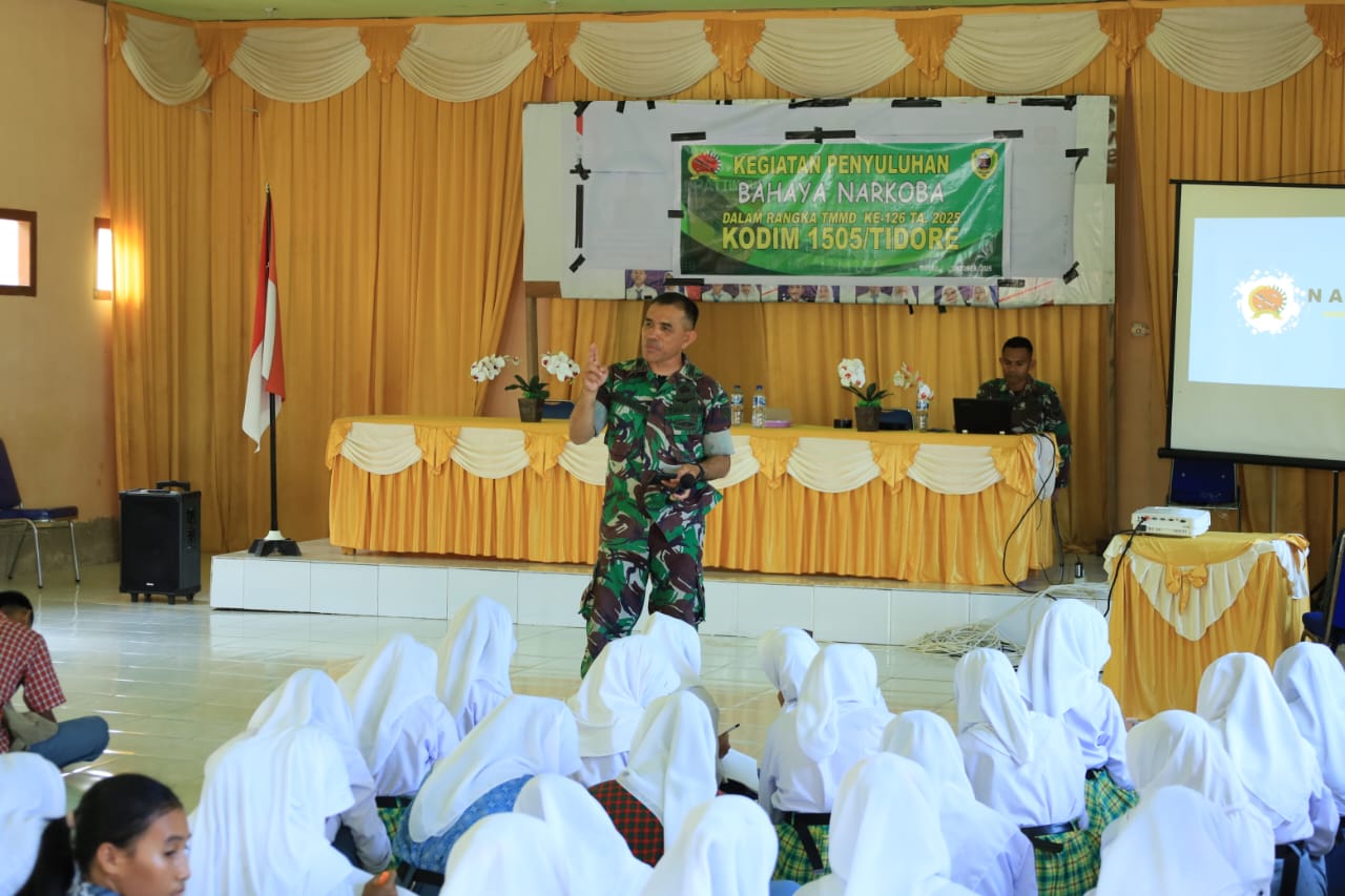 Tidore Kepulauan — Dalam rangka membangun generasi muda yang berkarakter dan bebas dari pengaruh negatif narkoba, Satuan Tugas (Satgas) TNI Manunggal Membangun Desa (TMMD) ke-126 Kodim 1505/Tidore melaksanakan kegiatan penyuluhan tentang bahaya narkoba kepada para pelajar di SMAN Negeri 7 Tidore Kepulauan, Kecamatan Oba Selatan, Kota Tidore Kepulauan, Sabtu (25/10/2025).