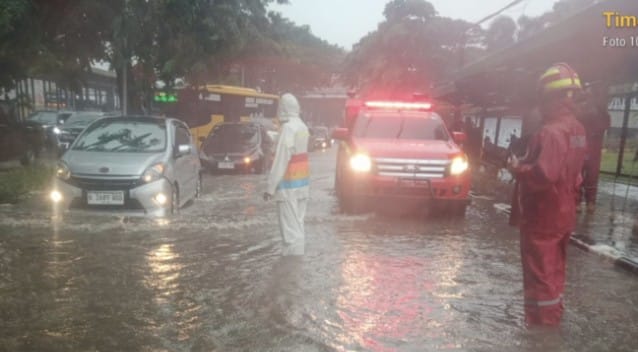 Selain melakukan pengecekan ketinggian genangan air yang terpantau sekitar 30 cm, petugas juga melaksanakan pengaturan lalu lintas guna mencegah kemacetan serta memastikan keselamatan para pengguna jalan yang melintas di kawasan tersebut.