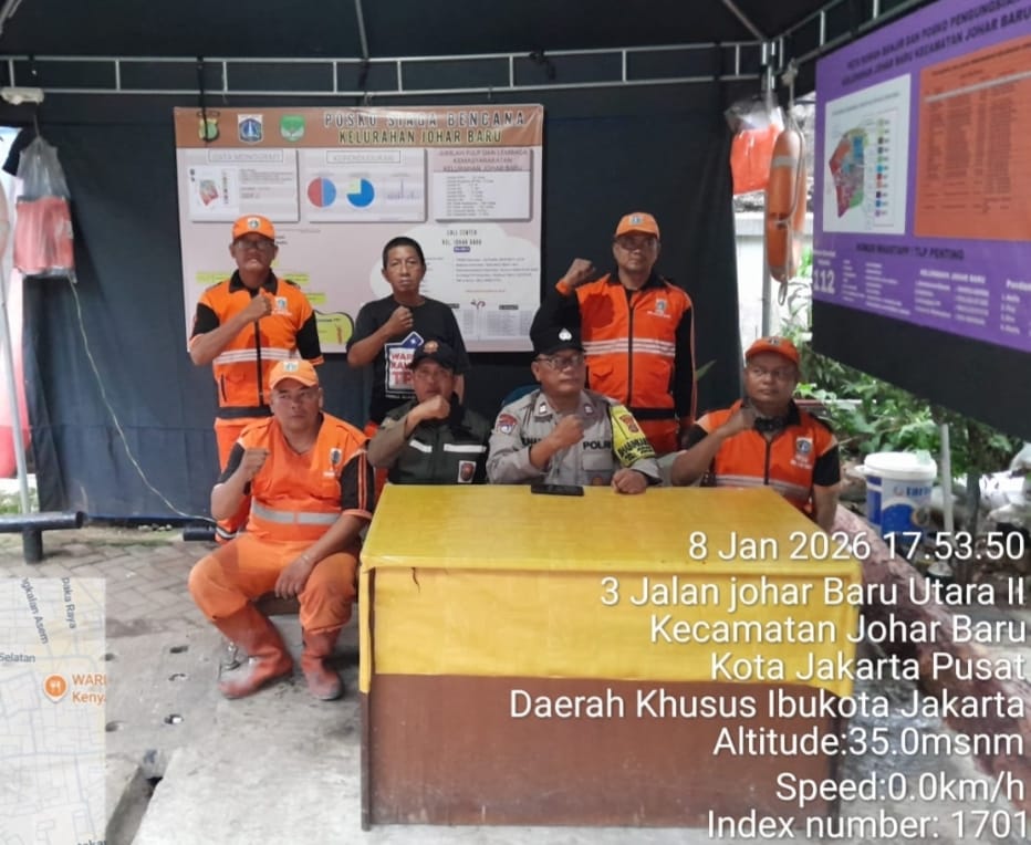 Jakarta Pusat – Sinergi antar unsur kewilayahan terus diperkuat guna menjaga situasi keamanan dan ketertiban masyarakat (kamtibmas) di wilayah Johar Baru. Pada Kamis (8/1/2026) pukul 17.30 WIB, Bhabinkamtibmas Kelurahan Johar Baru bersama Satpol PP dan Petugas Penanganan Prasarana dan Sarana Umum (PPSU) melaksanakan koordinasi kamtibmas dan cooling system di Posko Bencana Kelurahan Johar Baru, Jalan Johar Baru Utara III RW 03, Jakarta Pusat.