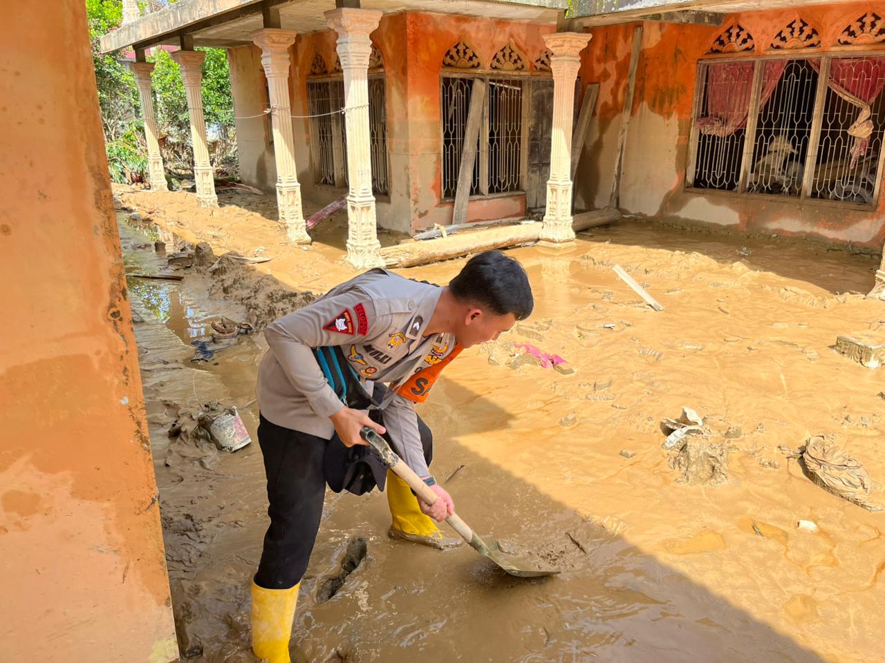 Aceh Tamiang — Personel Satuan Brimob Polda Aceh bersinergi dengan Tentara Nasional Indonesia (TNI) melaksanakan pembersihan sisa lumpur pascabanjir di Puskesmas Kota Kuala Simpang, Kabupaten Aceh Tamiang, Jumat (26/12/2026).